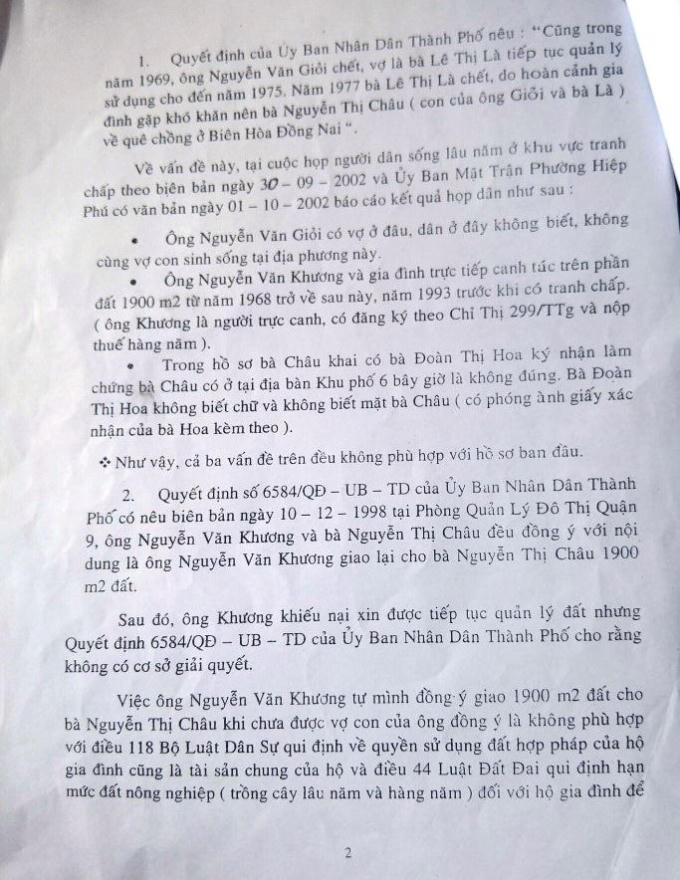 Cụ thể, công văn của Ủy ban MTTQ Việt Nam TP HCM cho biết, theo kết quả xác minh, những người địa phương đều không biết ông Giỏi có vợ ở đâu và không có sống tại địa phương; Ông Khương và gia đình trực tiếp canh tác trên phần đất 1.900m2 từ năm 1968 cho đến khi tranh chấp; Trong hồ sơ bà Châu khai có bà Đoàn Thị Hoa ký nhận làm chứng bà Châu có ở tại địa bàn Khu phố 6 bây giờ là không đúng, vì qua xác minh bà Hoa không biết chữ, không biết mặt bà Châu; Việc ông Khương tự mình đồng ý giao 1.900m2 cho bà Châu khi chưa được vợ con của ông đồng ý là không phù hợp quy định của pháp luật;…