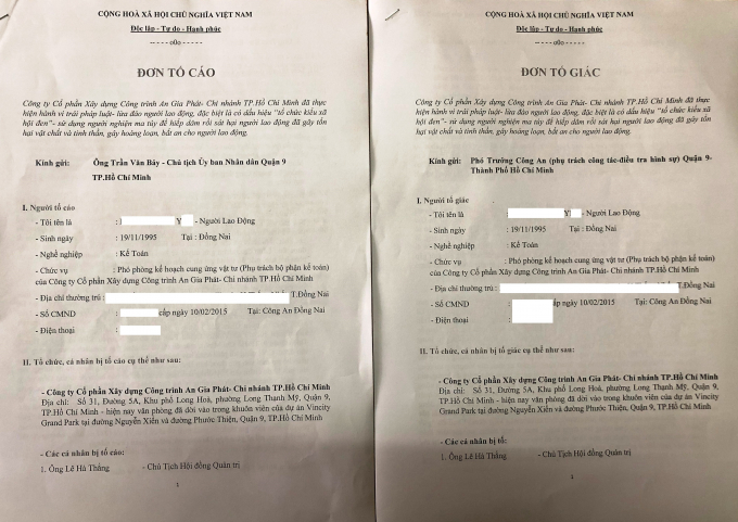 Được biết, hiện chị Y đã gửi đơn tố cáo Công ty Cổ phần Xây dựng Công trình An Gia Phát đến Chủ tịch UBND Quận 9 và Công an Quận 9, TP HCM, đồng thời cung cấp hồ sơ liên quan đến vụ việc trên.