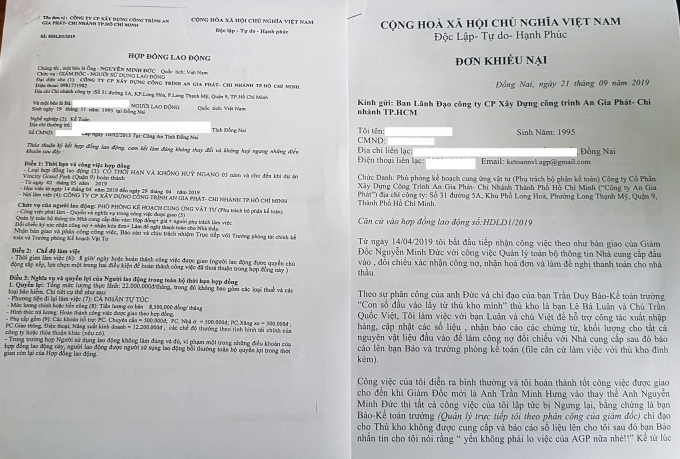 Hợp đồng lao động và đơn khiếu nại của chị Y gửi Công ty An Gia Phát.