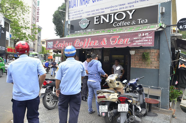 Khoảng 5 phút sau, ông Lê Hồng Quang đã chỉ đạo lực lượng trật tự đô thị phường Nguyễn Cư Trinh đến kiểm tra và xử phạt đối với quán cà phê nói trên về hành vi chiếm dụng hè phố làm điểm giữ xe.