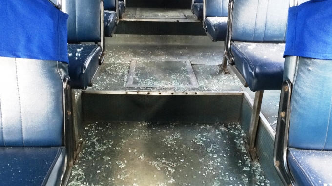 Cú tông mạnh tạo ra một tiếng động lớn, phần đầu xe bồn đâm lệch qua đầu xe buýt rồi trượt dài theo thành xe. Xe buýt lệch sang bên đường tông vào phần bê tông ở vỉa cây xanh. Lúc đó, trên xe buýt có khoảng 15 người, xe bồn tông vào khiến kính một bên thành xe vỡ vụn, tất cả mọi người hoảng loạn, nhiều người bị kính xe vỡ văng phải hét lên. May mắn không ai bị thương nặng.