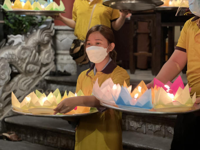 Các Phật tử đã phụ giúp, chuẩn bị hàng nghìn đèn hoa từ rất sớm để góp phần trang trọng trong việc thực hiện nghi lễ thả hoa đăng.