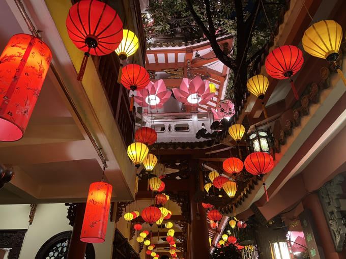 Đèn lồng được trang trí xung quanh Chùa, không khí trong buổi tưởng niệm thêm phần trang trọng.
