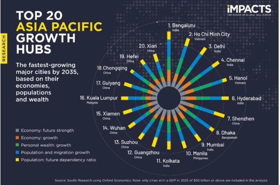 Bảng xếp hạng dựa trên phân tích 245 thành phố, cho thấy xu hướng tăng trưởng đang tập trung mạnh mẽ tại châu Á nhờ lợi thế dân số trẻ, tốc độ đô thị hóa nhanh và sự dịch chuyển sản xuất toàn cầu.