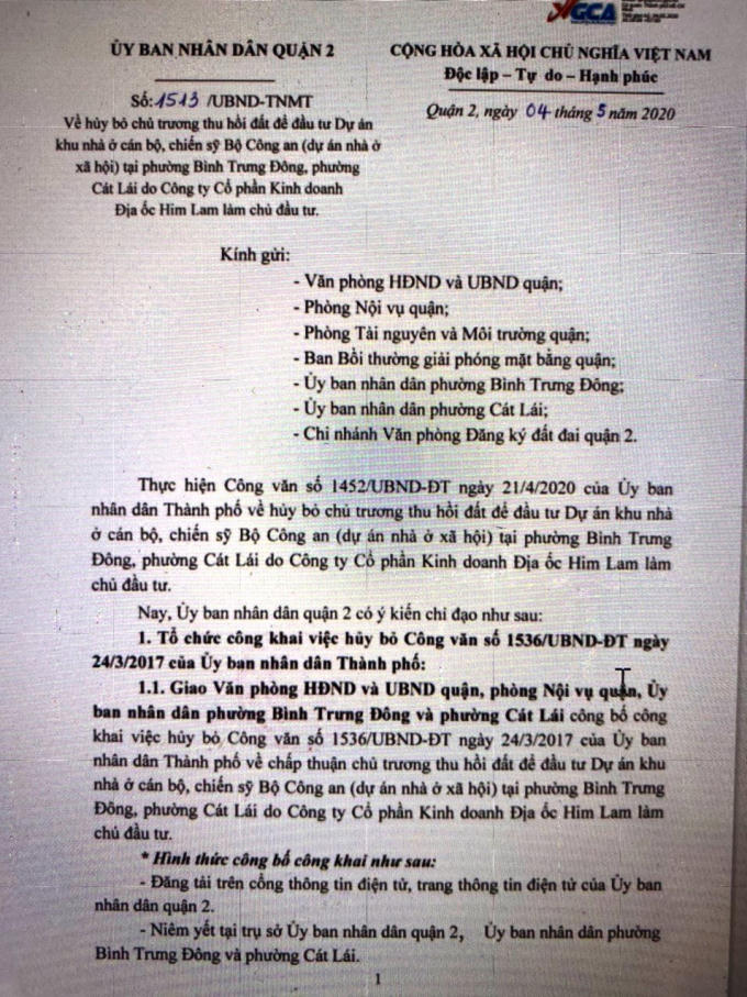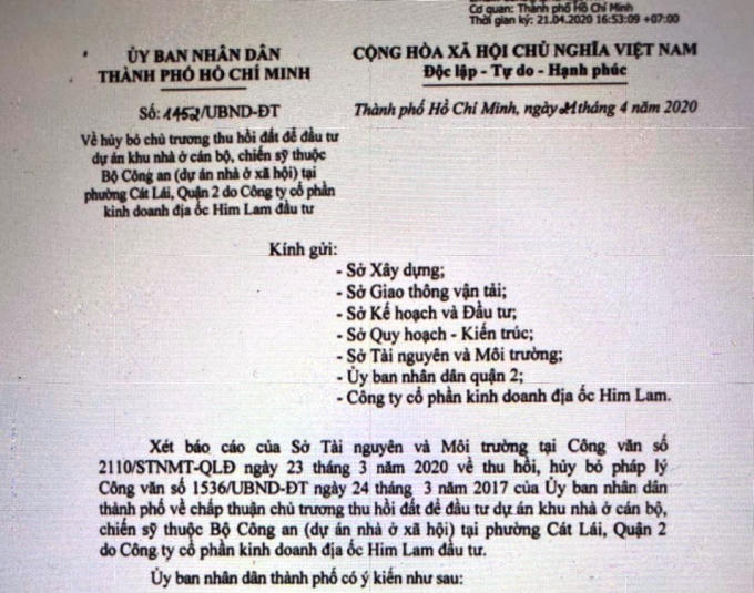 Công văn số 1452/UBND-ĐT ngày 21/4/2020 của UBND TP HCM về việc hủy bỏ chủ trương thu hồi đất để đầu tư dự án Khu nhà ở cán bộ, chiến sỹ Bộ Công an (dự án nhà ở xã hội) tại phường Bình Trưng Đông và phường Cát Lái (Quận 2) do Công ty Cổ phần Kinh doanh Địa ốc Him Lam (Tập đoàn Him Lam) làm chủ đầu tư.
