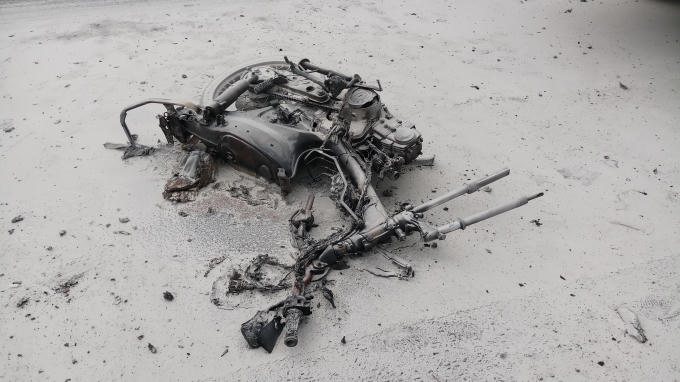 Riêng chiếc xe máy bị kéo lê đi gần 30m rồi bốc cháy ngùn ngụt giữa đường.