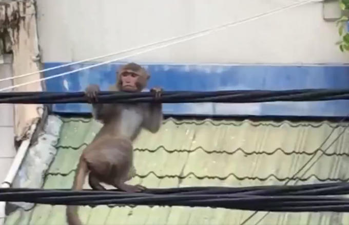 Con khỉ có đuôi dài trên leo trèo, đu nhảy trên dây điện cũng như trên dây cáp viễn thông di chuyển về hướng đường Ngô Tất Tố.