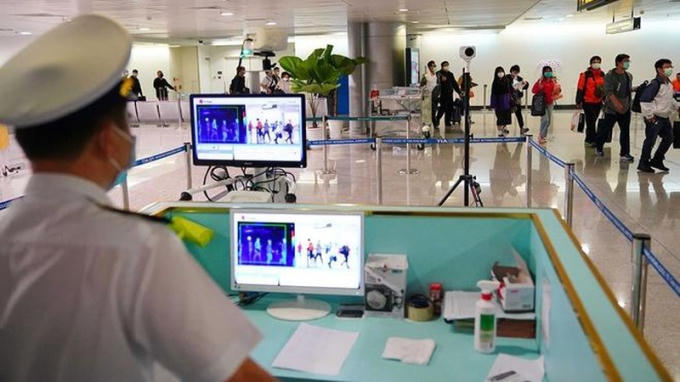 Đo thân nhiệt cho người nhập cảnh tại sân bay Tân Sơn Nhất.