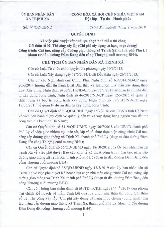 Sau đó 2 ngày, ông Nguyễn Phú Độ - Chủ tịch UBND xã Trịnh Xá, TP.Phủ Lý đã ký Quyết định số 56/QĐ-UBND ngày 23/11/2018 cho Công ty TNHH xây dựng và dịch vụ thương mại Khánh Hưng trúng sát giá cũng một gói thầu có kinh phí đầu tư lớn.