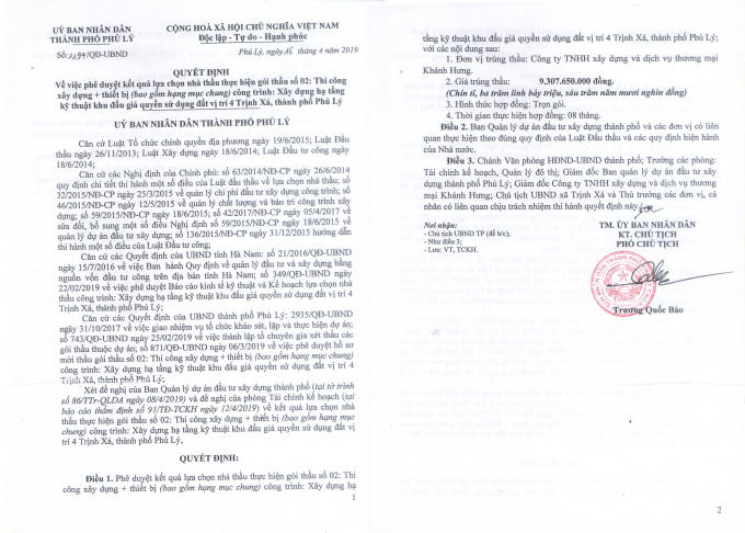 Giá gói thầu là 9.316.900.000 VND, ông Trương Quốc Bảo – Phó Chủ tịch UBND TP.Phủ Lý đã ký cho Công ty TNHH xây dựng và dịch vụ thương mại Khánh Hưng trúng với giá thầu 9.307.650.000 VND theo quyết định phê duyệt số 1194/QĐ-UBND ngày 16/4/2019.