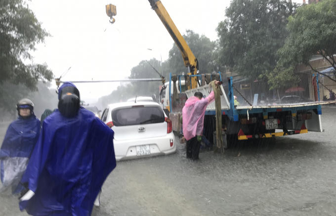 Tất cả các tuyến đường TP Vinh gần như đã bị nhấn chìm, có nơi ngập sâu đến hơn 1 m, xe cộ chết máy không thể lưu thông.