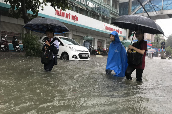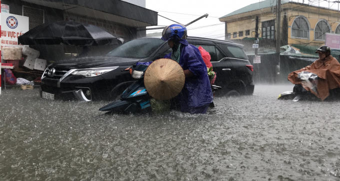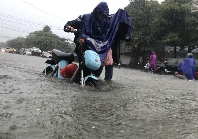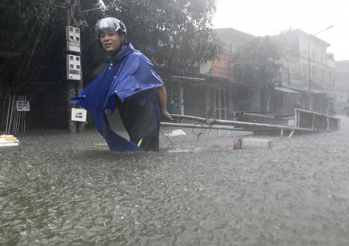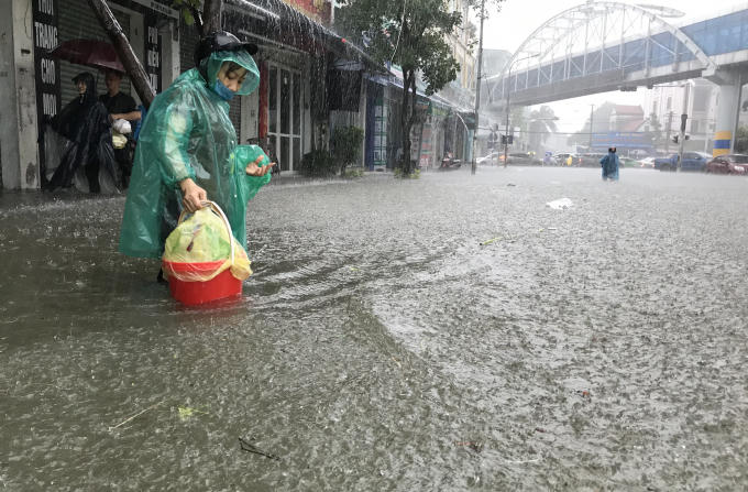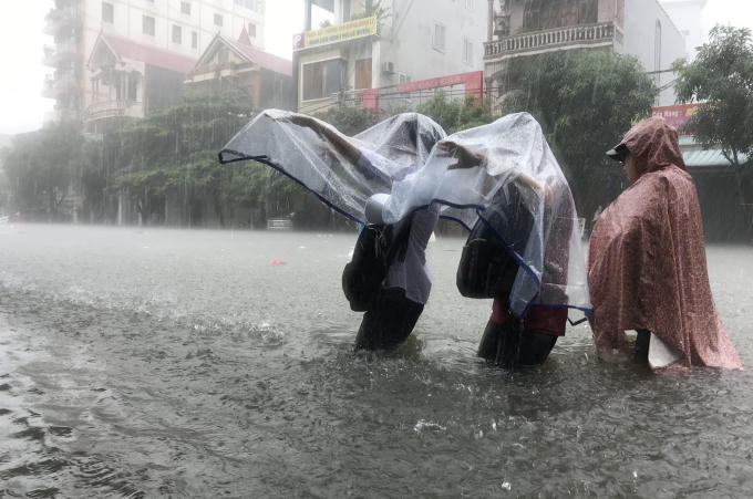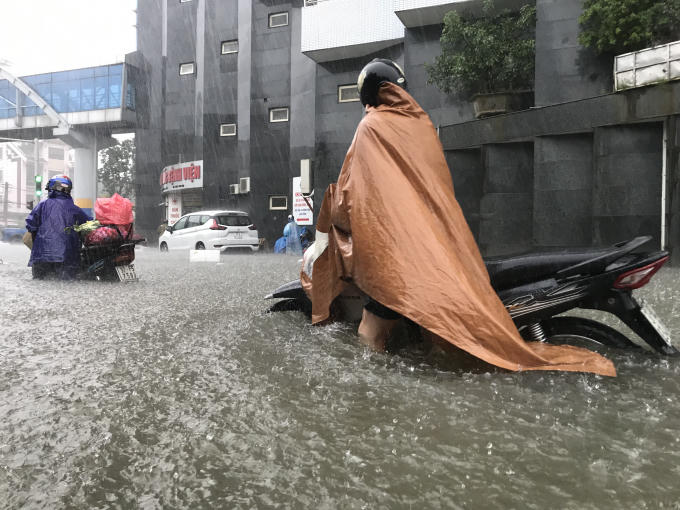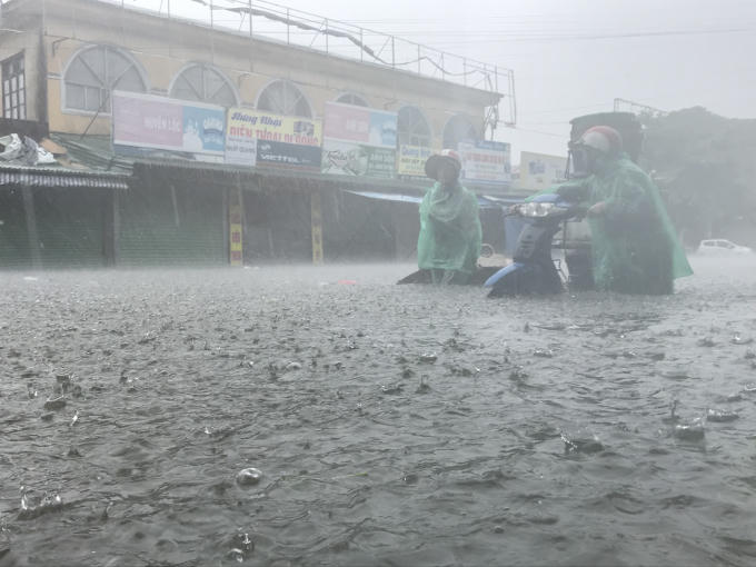 Những tuyến phố bị nhấn chìm, người và phương tiện bì bõm "bơi" trong biển nước.