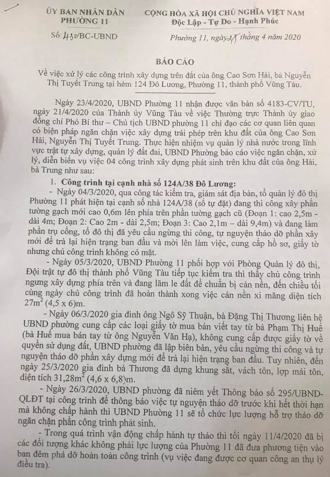 Theo chỉ đạo của TP Vũng Tàu, ngày 27/4/2020, UBND phường 11 đã có Báo cáo số 430/BC-UBND (Báo cáo 430) về việc xử lý các công trình xây dựng trên đất của ông Cao Sơn Hải.