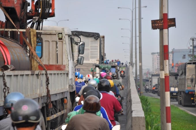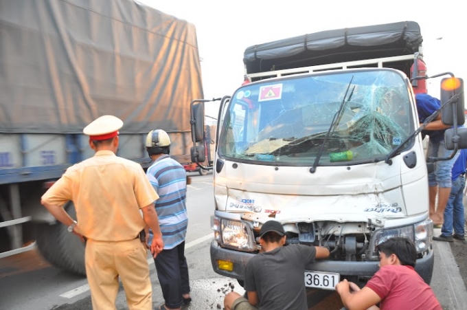 Khi xe tải đang lên cầu thì bất ngờ phanh gấp khiến 5 ôtô đi phía sau lần lượt tông vào đuôi xe, hàng ngàn phương tiện trên tuyến quốc lộ 1A nối đuôi nhau, ùn tắc trong thời gian dài.