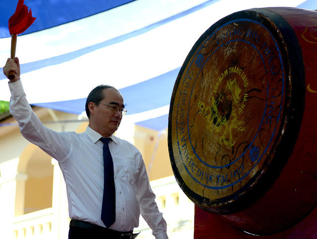 Sáng 5/9, gần 1,7 triệu học sinh tại TPHCM tham gia ngày tựu trường chào đón năm học mới. Tại trường THPT chuyên Lê Hồng Phong, quận 5, có sự tham dự của nguyên Chủ tịch nước Nguyễn Minh Triết, Bí thư Thành uỷ TPHCM Nguyễn Thiện Nhân cùng nhiều cán bộ, giáo viên và học sinh.