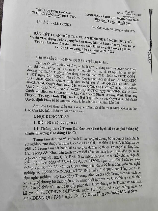 Theo hồ sơ vụ án, ngày 6/8/2024, Cơ quan CSĐT CA tỉnh Lào Cai đã ban hành kết luận điều tra vụ án hình sự vụ “Lợi dụng chức vụ quyền hạn trong khi thi hành công vụ” xảy ra tại Trung tâm đào tạo và sát hạch lái xe cơ giới đường bộ thuộc Trường Cao đẳng Lào Cai năm 2021,2022.