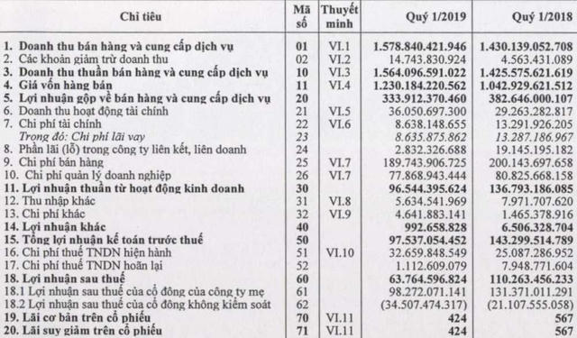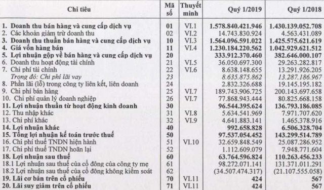 Sau khi trừ đi các chi phí phát sinh trong kỳ, Habeco ghi nhận xấp xỉ 64 tỷ đồng lợi nhuận sau thuế trong quý 1, giảm mạnh 42% so với cùng kỳ năm trước. Trong đó, lợi nhuận cổ đông công ty mẹ là 98,3 tỷ đồng, giảm 25%.