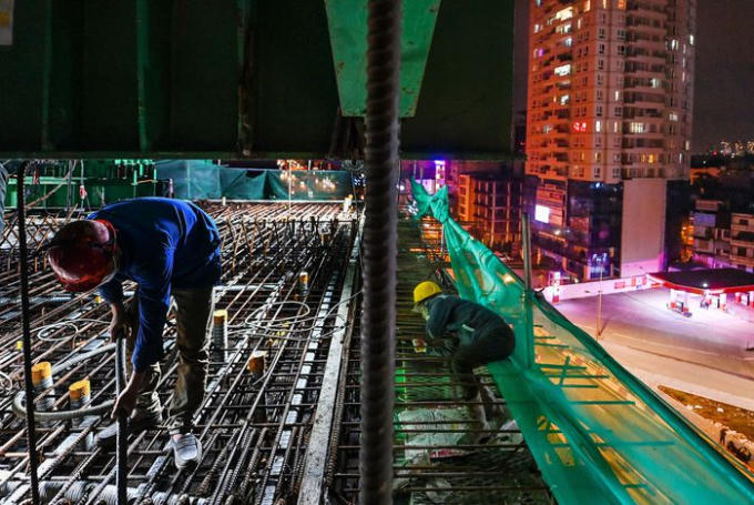 Trước khi đổ bê tông, các công nhân sẽ hoàn thiện hệ thống kết cấu thép với chiều dài khoảng 4-5 m. Sau khi kết cấu thép được hoàn thiện, bê tông tươi sẽ được mang đến đổ trực tiếp để tạo nên kết cấu dầm của đường trên cao.