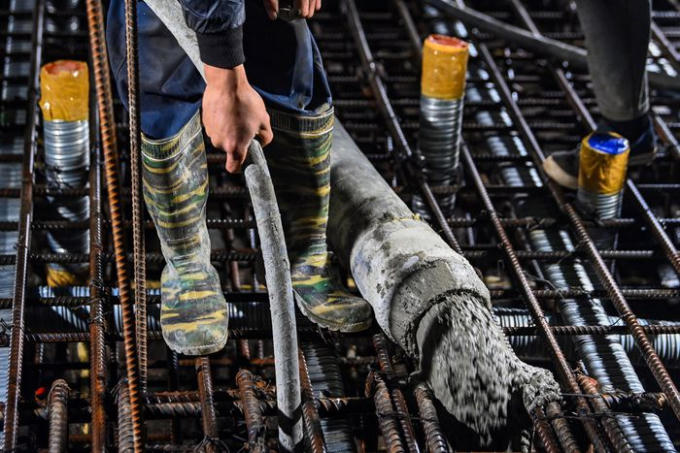 Công nhân đầm bê tông sau khi đổ lên kết cấu cốt thép. Đây là giai đoạn quan trọng nhất quyết định đến chất lượng kết cấu bê tông sau khi đổ nhằm làm cho hỗn hợp vữa trở nên đặc chắc, mặt ngoài không bị rỗ và bám chặt vào cốt thép.