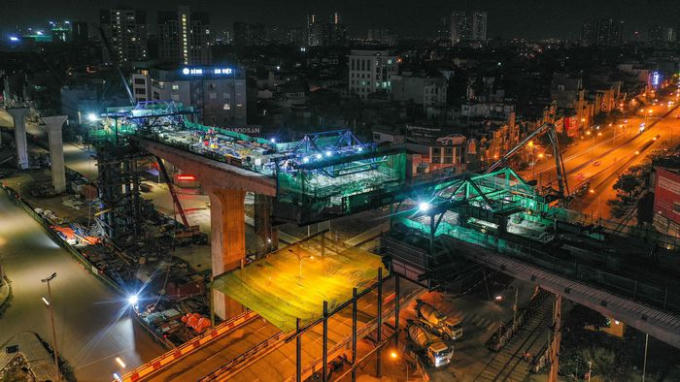 Trong khi đó, đoạn tuyến trên cao Ngã Tư Vọng - cầu Vĩnh Tuy đang được đẩy nhanh tiến độ. Hiện 100% các trụ đường trên cao đã hoàn thành. Nhà thầu đang tập trung lao dầm, hoàn thiện mặt đường cùng các hạng mục khác.