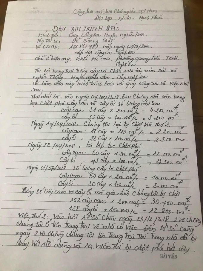 Theo đơn trình báo của ông Đỗ Quang Quế (47 tuổi, một chủ trang trại tại xã Nghĩa Thắng, huyện Nghĩa Đàn, Nghệ An) thời gian qua kẻ xấu liên tục phá hoại trang trại của ông bằng nhiều hình thức khác nhau gây thiệt hại nặng nề. Cây trồng trên diện tích trang trại hơn 2 ha nhiều lần bị chặt phá. Thậm chí gần đây nhất ngôi nhà trong trang trại cùng nhiều vật dụng có giá trị cũng bị thiêu rụi đẩy gia đình ông vào cảnh cùng cực.