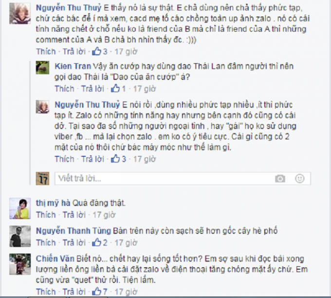 Thành viên Nguyễn Thu Thủy thì viết: "Em thấy nó là sự thật. Em chả dùng nên chả thấy phức tạp, chứ các bác để ý mà xem, các mẹ tố cáo chồng toàn up ảnh Zalo. Nó có cái tính năng chết ở chỗ nếu không là friend (bạn bè) của B mà chỉ là bạn bè của A thì những comment (bình luận) giữa A và B chả bao giờ thấy được".