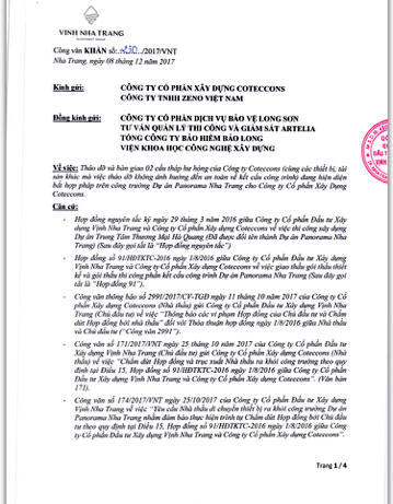 Mới đây ngày 8/12/2017, Chủ đầu tư là Công ty Vịnh Nha Trang đã có Công văn khẩn số 230/2017/VNT gửi Coteccons, Công ty Zeno cùng nhiều đơn vị, cơ quan chức năng khác thông báo về việc tháo dỡ và bàn giao 2 cẩu tháp hư hỏng.