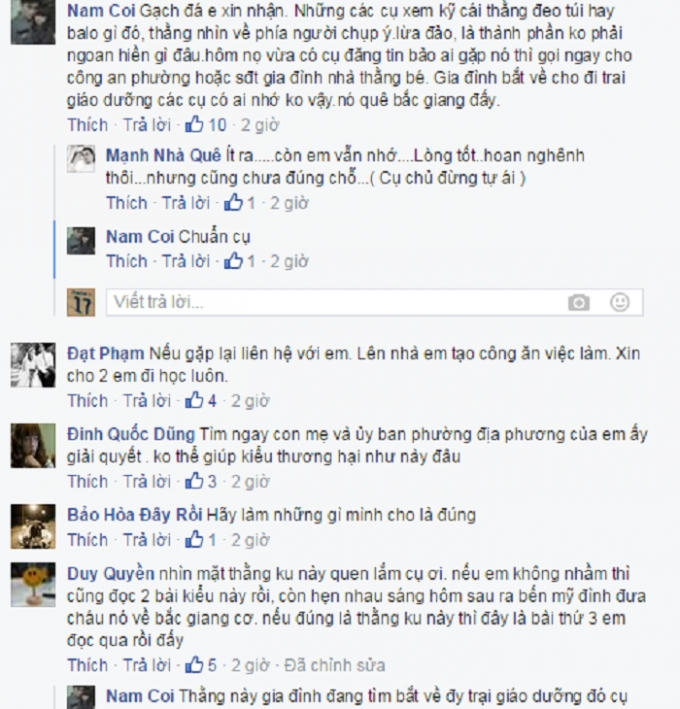 Không chỉ Facebooker Nam Coi mà rất nhiều thành viên khác cũng viết bình luận cho rằng, câu chuyện mà hai anh em nhỏ tuổi kia kể thực chất chỉ là một màn kịch đánh vào lòng thương người của những người đi đường. Tuy vậy, hành động của người đã giúp đỡ hai anh em vẫn nhận được sự ủng hộ lớn của các thành viên.