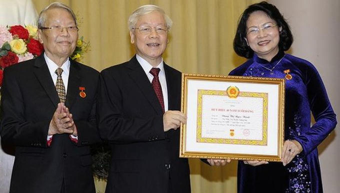 Tổng Bí thư, Chủ tịch nước Nguyễn Phú Trọng trao Huy hiệu Đảng tặng Phó Chủ tịch nước Đặng Thị Ngọc Thịnh. Ảnh: TTXVN