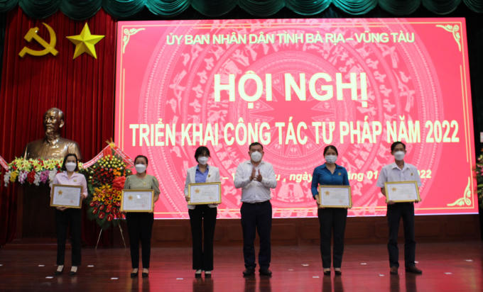 Thay mặt Bộ Tư pháp, Cục trưởng Cục Công tác phía Nam Nguyễn Thanh Bình đã trao tặng Kỷ niệm chương “Vì sự nghiệp Tư pháp” cho những cá nhân đạt được; đồng thời tại Hội nghị đã trao tặng Bằng khen của Chủ tịch UBND tỉnh Bà Rịa – Vũng Tàu cho 12 tập thể đã có thành tích xuất sắc trong thực hiện các đề án theo quyết định số 705/2017 của Thủ tướng Chính phủ trên địa bàn tỉnh.