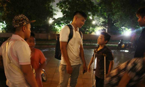 Anh đi qua quảng trường đông người để trò chuyện với một nhóm cậu bé mà anh quen. Minh (tên đã được thay đổi), 12 tuổi, nhảy lò cò về phía trước khi chống nạng và ôm lấy Vi, cánh tay cậu chằng chịt vết sẹo. Cậu bé bị mất một chân vì bị điện giật và gia đình không đủ điều kiện chữa trị. Vi đang khuyên Minh dừng đi ăn xin và đến khu nhà của tổ chức.