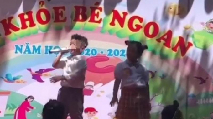 Hai bé đang theo học trường mầm non hát trên sân khấu nhạc không phù hợp với lứa tuổi.