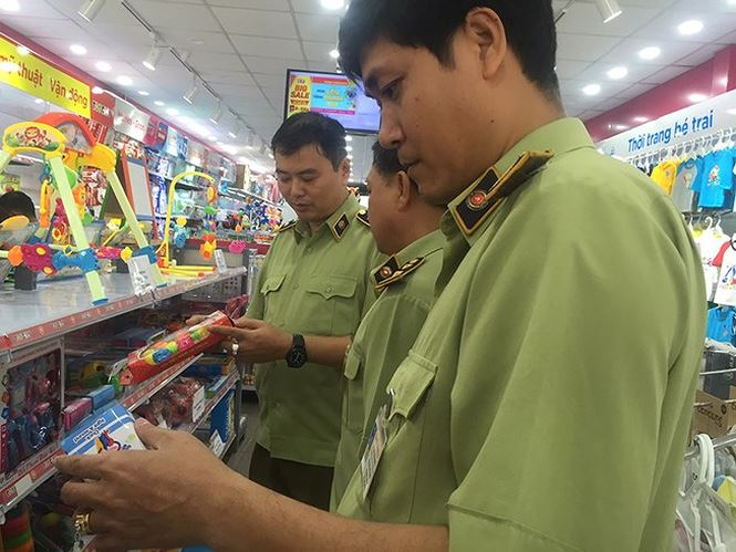 | Lực lượng QLTT kiểm tra xuất xứ hàng hóa tại một doanh nghiệp kinh doanh sản phẩm dành cho trẻ em. |