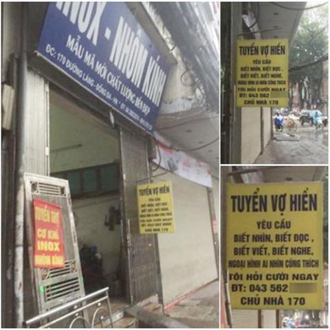 | Khoảng 1 tuần trước, trước cửa một ngôi nhà trên đường Láng, quận Đống Đa, Hà Nội bất ngờ xuất hiện một tấm biển “Tuyển vợ hiền” thu hút sự quan tâm của rất nhiều người. Nội dung tấm biển ghi rõ: Tuyển vợ hiền. Yêu cầu biết nhìn, biết đọc, biết viết, biết nghe, ngoại hình ai nhìn cũng thích. Tôi hỏi cưới ngay. Qua tìm hiểu được biết chủ nhân của tấm biển tuyển vợ này là ông N.V.V., 49 tuổi. Ông này thừa nhận công khai đăng biển tuyển vợ vì người vợ hiện tại của ông không muốn sống với ông nữa. |