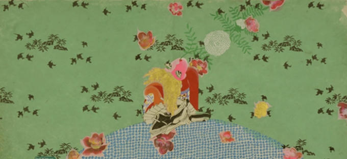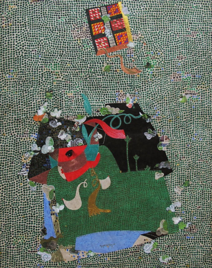 Với cách vẽ bán trừu tượng, Nguyễn Thế Hùng kết hợp những mảng miếng cắt dán với vàng lá và chất liệu truyền thống là giấy dó được bồi trên vải.