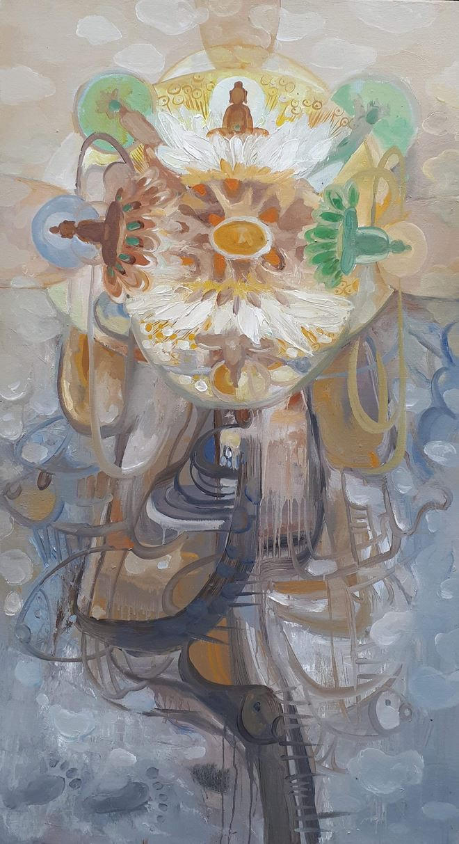 Lê Trần Hậu Anh (1981) mang đến không gian triển lãm những bức tranh rực rỡ vẽ hoa. Nhưng thú vị ở chỗ, người xem cảm giác như đó không chỉ là những bông hoa. Tranh của Hậu Anh chứa đựng trong đó cả sự xôn xao của vườn xuân, cả sự ngỡ ngàng của chú chim bé nhỏ trước những chùm hoa tím ngắt, và có lẽ, cả tiếng chim đang hòa nhịp vào bản nhạc du dương của mùa xuân nữa. Giống như những khung cửa sổ nhìn ra vườn, tranh Hậu Anh khiến người ta mỉm cười bởi vẻ đẹp không thể chối bỏ của một thiên nhiên tràn đầy, được tái hiện bằng những gam màu rực rỡ mà vẫn đằm thắm sang trọng và quyến rũ.