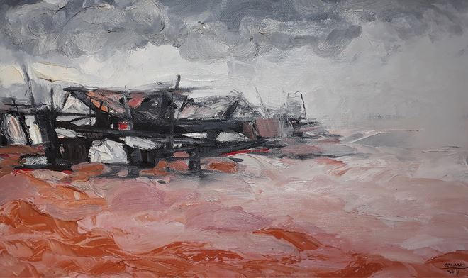 Tranh của Nguyễn Quốc Thắng (1976) vẽ những góc phố, góc làng, những mái nhà nâu đỏ, những mảng tường rong rêu… Cứ như thể người họa sĩ đang ngao du trong một chốn mà anh đắm đuối yêu, và hát về những ngõ phố vắng lặng, bình yên bằng giai điệu của những sắc màu. Nét vẽ nhanh, mạnh dạn mà tinh tế, từng vệt màu quệt trên nền toan đều mang dấu ấn của xúc cảm, khiến tranh của Quốc Thắng giàu nhịp điệu mà hài hòa, đẹp mắt.