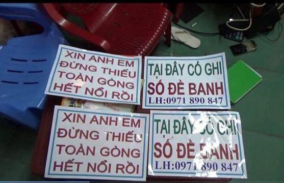 Để câu khách, các đối tượng dán quanh nhà nhiều tờ rơi ghi nội dung “Tại đây có ghi số đề banh” và lôi kéo nhiều con bạc tham gia.