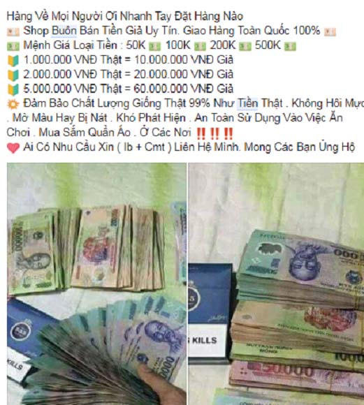 Nhiều trang mạng xã hội vẫn công khai rao bán tiền giả.