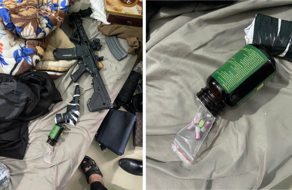 Đến 16h cùng ngày, Công an phường phối hợp Phòng CSĐT tội phạm về ma túy khám xét khẩn cấp nơi ở của Thành, thu giữ 5 viên ma túy dạng con nhộng và 2 khẩu súng nghi là vũ khí quân dụng, gồm 1 súng trường dạng AR15, 1 súng ngắn dạng K59 cùng 2 hộp tiếp đạn chứa 7 viên.