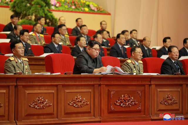 | Nhà lãnh đạo Kim Jong-un tham dự hội nghị cùng các quan chức Triều Tiên (Ảnh: Reuters) |