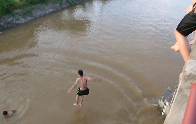 Một số em thiếu niên tham gia trò chơi khá mạo hiểm, nhảy từ trên đỉnh cống xuống nước, độ cao ước tính khoảng 5 - 6 m.