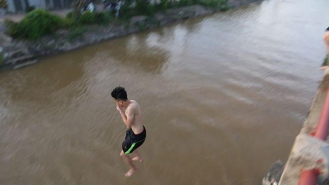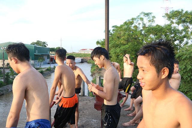 Các thiếu niên xếp hàng nhảy lần lượt xuống dòng kênh. "Thường trước khi nhảy bọn em cũng đã khởi động chân tay với lại ngày nào bọn em cũng bơi lội nên không có chuyện bị chuột rút hay tai nạng đáng tiếc xảy ra", một thiếu niên khác cho hay.