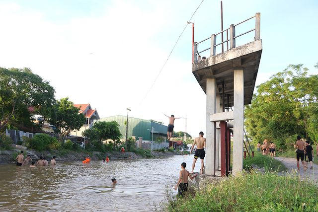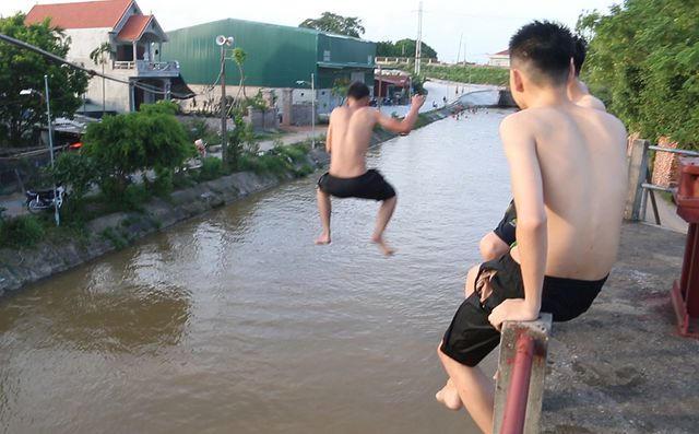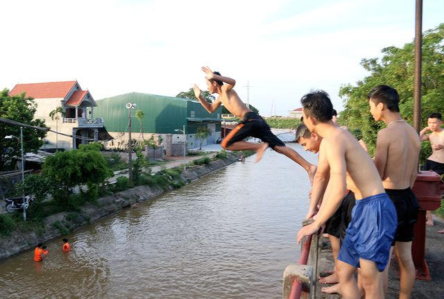 Vào mỗi buổi chiều, hàng chục thanh thiếu niên lại tụ tập tắm mát trên kênh thuỷ lợi Hồng Vân (Duyên Thái, Thường Tín, Hà Nội), chơi trò "nhảy cầu" khá mạo hiểm từ độ cao từ 5 - 6 m.