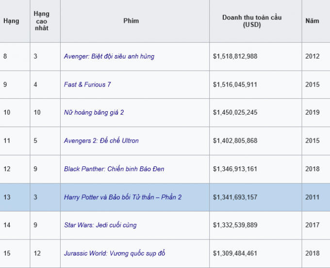 Phần phim Harry Potter và Bảo bối Tử thần 2 hiện đang đứng hạng 13 trong