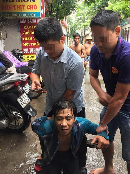 Hai công an lao theo người đàn ông đang bỏ chạy. Đến cuối ngõ 130 đường Tựu Liệt, nghi phạm lao thẳng ra ruộng rau muống, hai công an nhảy xuống bùn khống chế, bắt giữ.