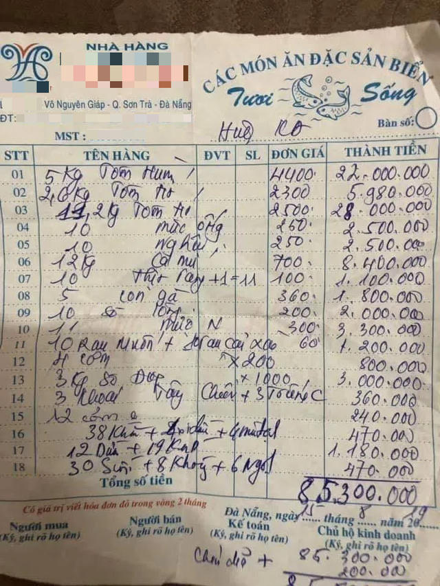 Tròn mắt với hóa đơn bữa hải sản giá 85 triệu đồng tại Đà Nẵng