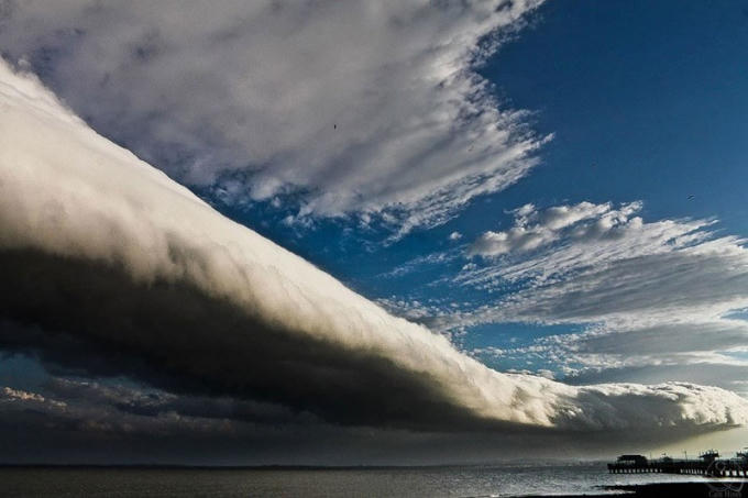 Gần đây, trước khi bão đổ bộ thường xuất hiện hiện tượng "mây sóng thần". Bầu trời đầy mây dày ngồn ngộn, như sóng thần đảo ngược lên trời, trông thật đáng sợ.