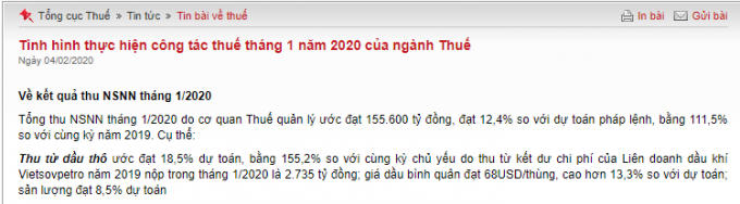 Cụ thể, thu từ dầu thô ước đạt 18,5% dự toán, bằng 155,2% so với cùng kỳ chủ yếu do thu từ kết dư chi phí của Liên doanh dầu khí Vietsovpetro năm 2019 nộp trong tháng 1/2020 là 2.735 tỷ đồng; giá dầu bình quân đạt 68USD/thùng, cao hơn 13,3% so với dự toán; sản lượng đạt 8,5% dự toán