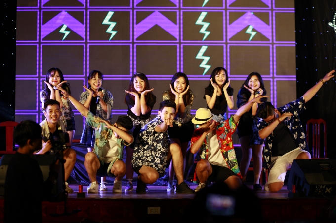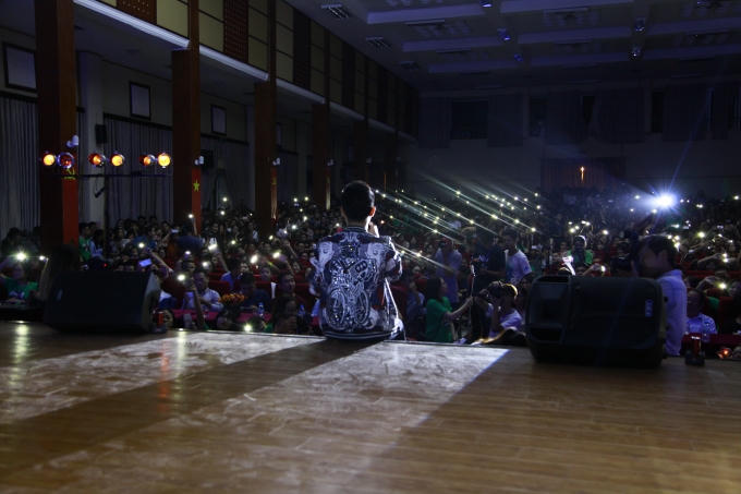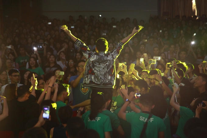 Trước sự xuất hiện của Trúc Nhân, cả hội trường lớn chật cứng người đã vỡ òa trong sự hò reo phấn khích và nhiệt tình của các bạn sinh viên.